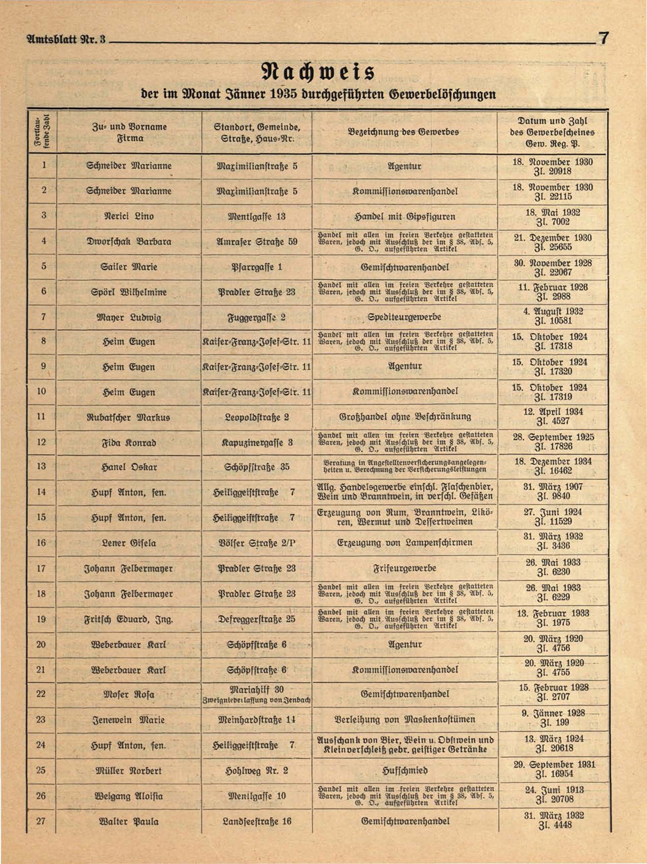 der im Monat Jänner 1935 durchgeführten Gewerbelöschungen