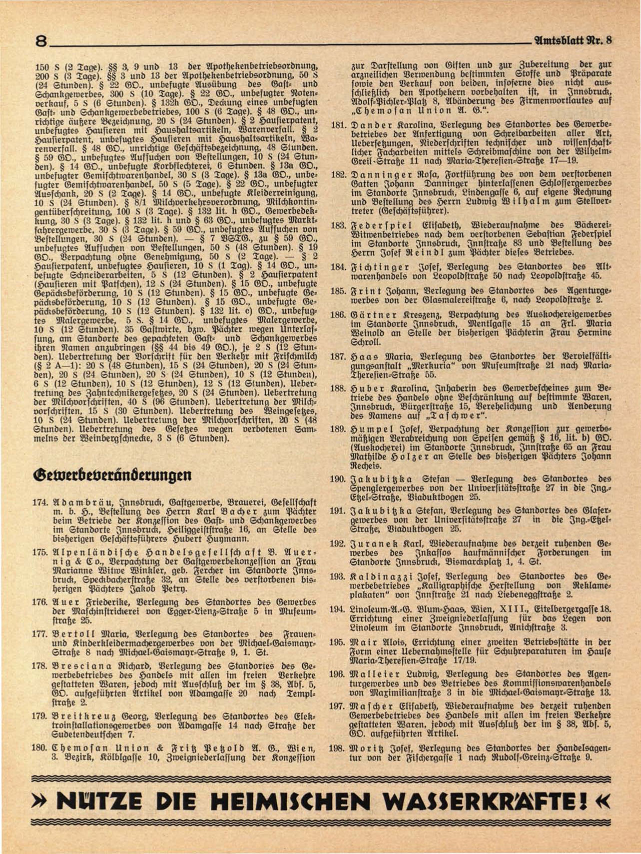 193. K a I d i n a z z i Josef, Verlegung des Standortes des Gewerbebetriebes „Kalligraphische Herstellung von Reklameplakaten" von Innstraßc 21 nach Liebeneggstraße 2.
