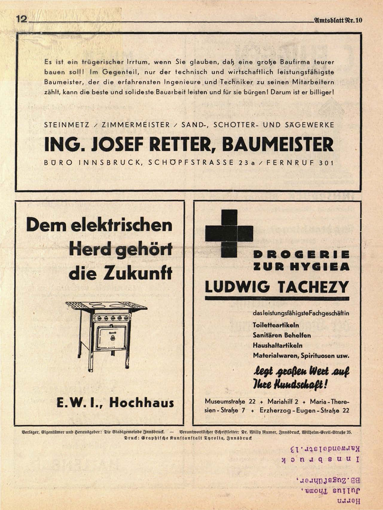 Verleger, Eigentümer und Herausgeber: Hie Stadtgemeinde Innsbruck. — Verantwortlicher Schriftleiter: Dr. Willy Rumer, Innsbruck, Wilhelm-Greil-Straße 25.