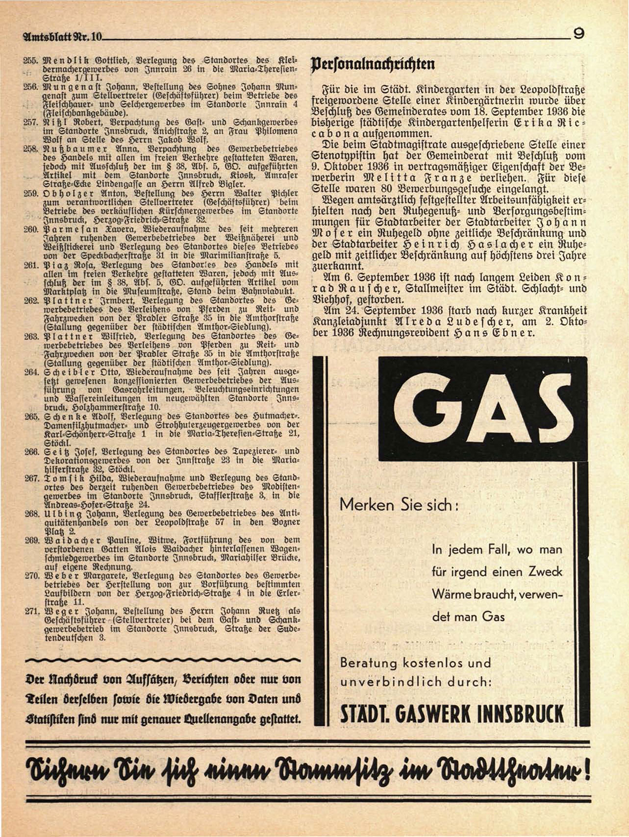 267. T o m s i k Hilda, Wiederaufnahme und Verlegung des Standortes des derzeit ruhenden Gewerbebetriebes des Modistengewerbes im Standorte Innsbruck, Stafflerstraße 3, in die