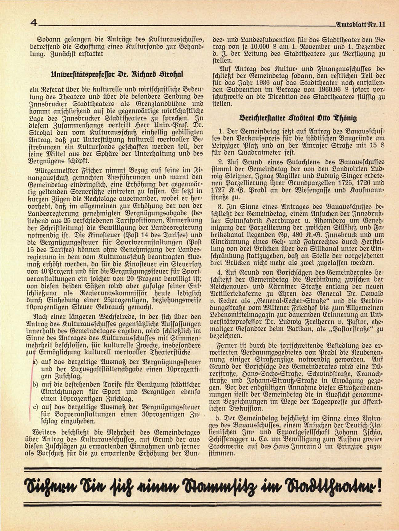 Grund der Vorschläge des Gemeinderates wird eine Dürerstraße, Hans-Sachs-Straße, Schwindstraße, Cranachstraße und Iohann-Strauß-Straße in Erwägung gezogen. Vor der endgültigen Annahme dieser Straßenbenennungen stellt der Gemeindetag die in Aussicht genommenen Bezeichnungen im Wege der Tagespresse zur öffentlichen Diskufsion.