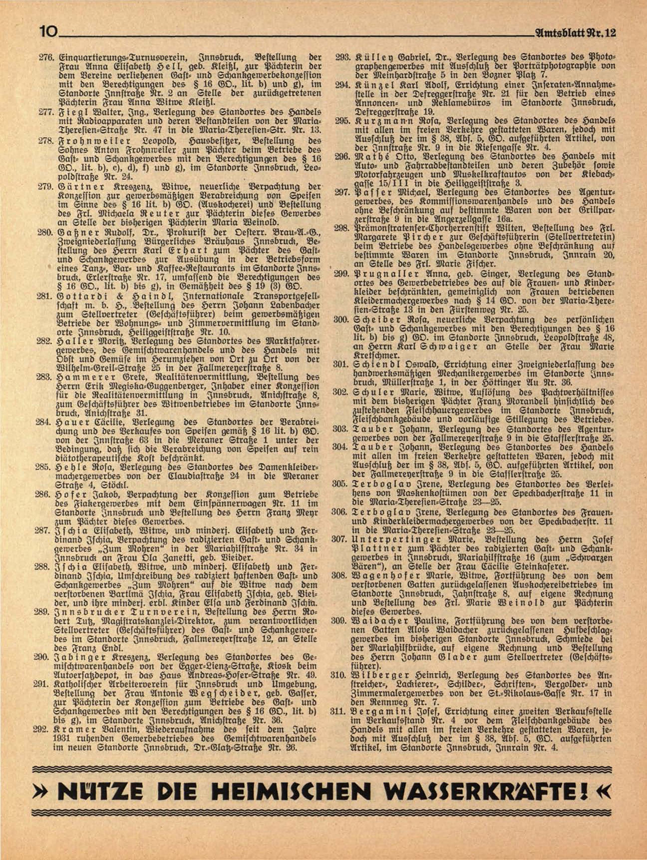 289. I n n s b r u c k e r T u r n v e r e i n , Bestellung des Herrn Robert Tutz, Magistratskanzlei-Direktor, zum verantwortlichen 309. W a i d a c h e r Pauline, Fortführung des von dem verstorbeStellvertreter (Geschäftsführer) des Gast- und Schankgewernen Gatten Alois Waidacher zurückgelassenen Hufbeschlagbes im Standorte Innsbruck, Fallmereyerstraße 12, an Stelle