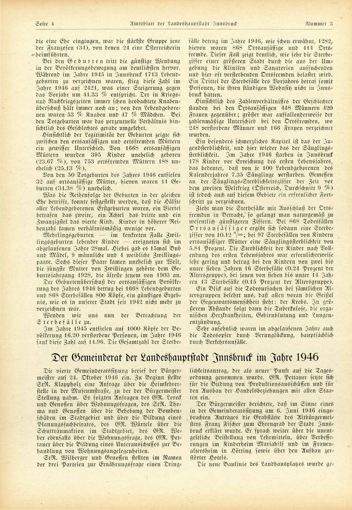 Ein besonders schmerzliches Kapitel ist das der I n gendstcrblichkeit, und hier wieder das der Säuglingssterblichkeit. I m Jähre 1946 starben in Innsbruck
