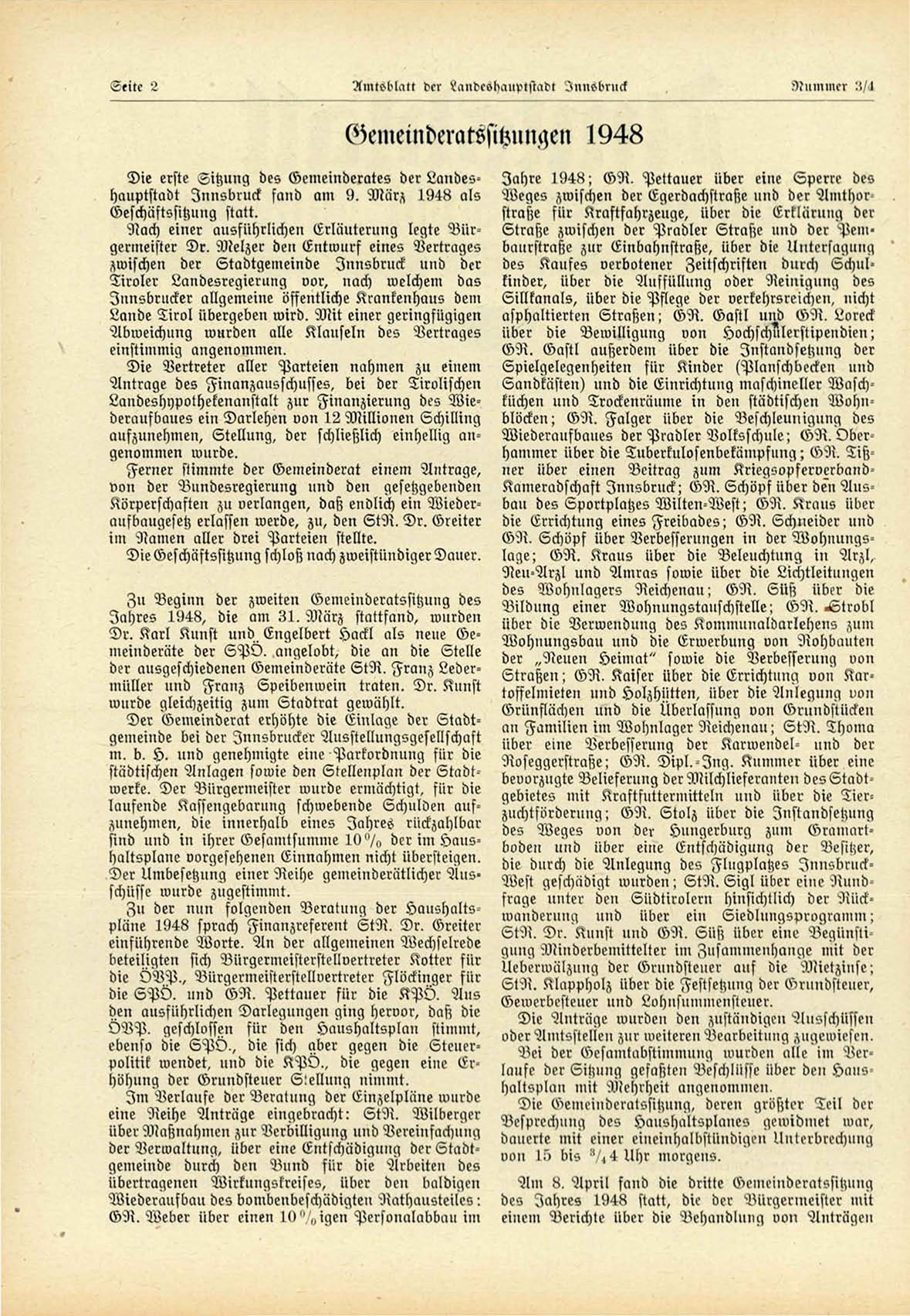 Wiederaufbaues der Pradler Volksschule; GN. Oberhammer über die Tuberkulosenbekämpfnng; GN. Tißner über einen Beitrag zum KriegoopferverbandKameradschaft Innsbruck; ON. Schöpf über den Ausbau des Sportplatzes Wilten-West; GN. Kraus über