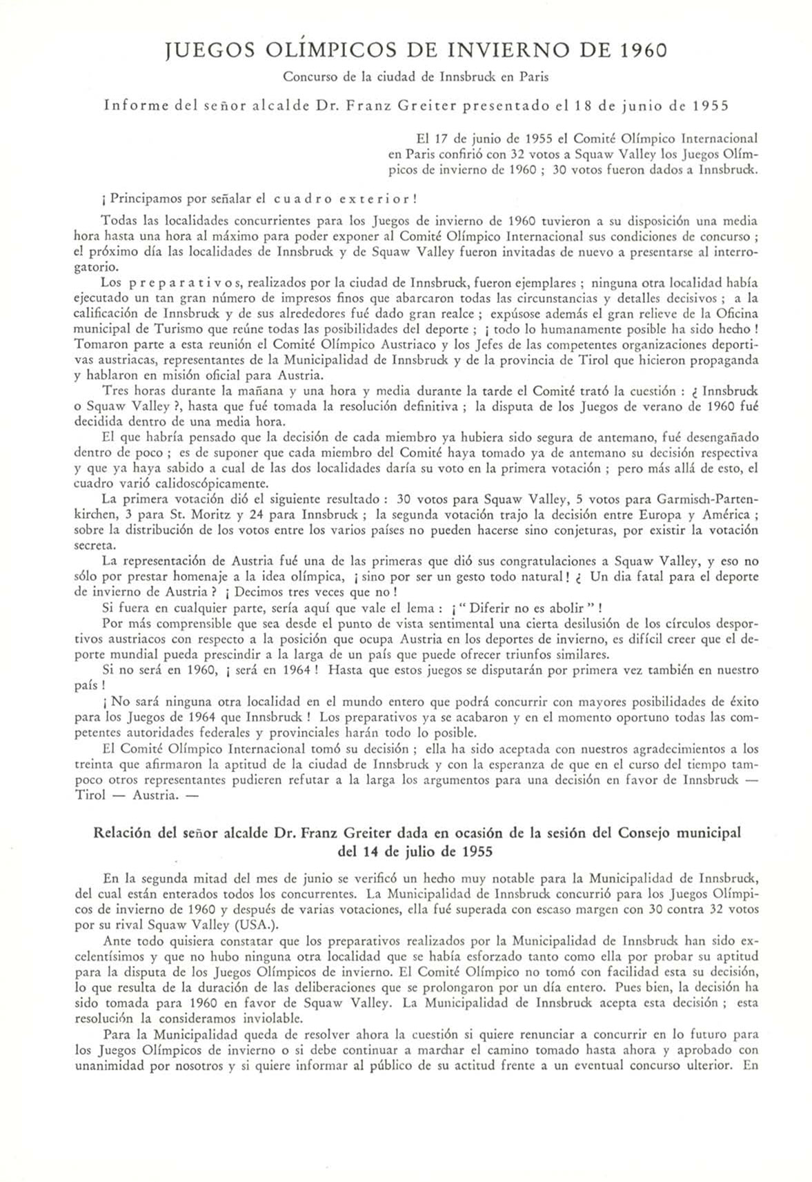 del cual e8tan enterado8 todo8 1o8 concurrente8. La I^lunicipalidad de Inn8t)luc^ concurri6 para lo8 ^uego8 Olimpico8 de invierno de 1960 v de8puä3 de varia3 vocacion«, ella fuc 8upcrada con e8ca2o margen con 30 contra 32 vot08