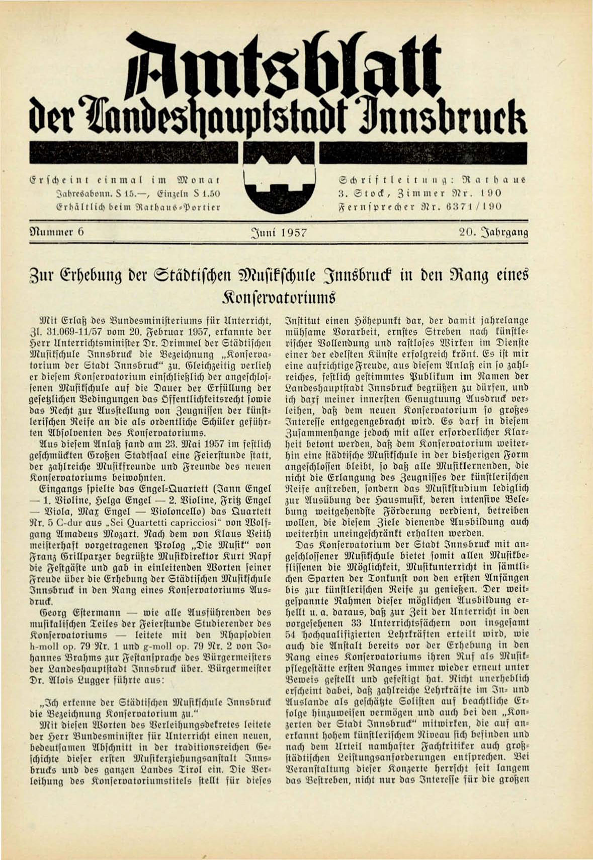 bedeutsamen Abschnitt in der trnditionsreichen Geschichte dieser ersten Musikerziehungsanstalt I n n s brucks und des ganzen Landes Tirol ein. Die Verleihung des Konservalorinmstitels stellt für dieses