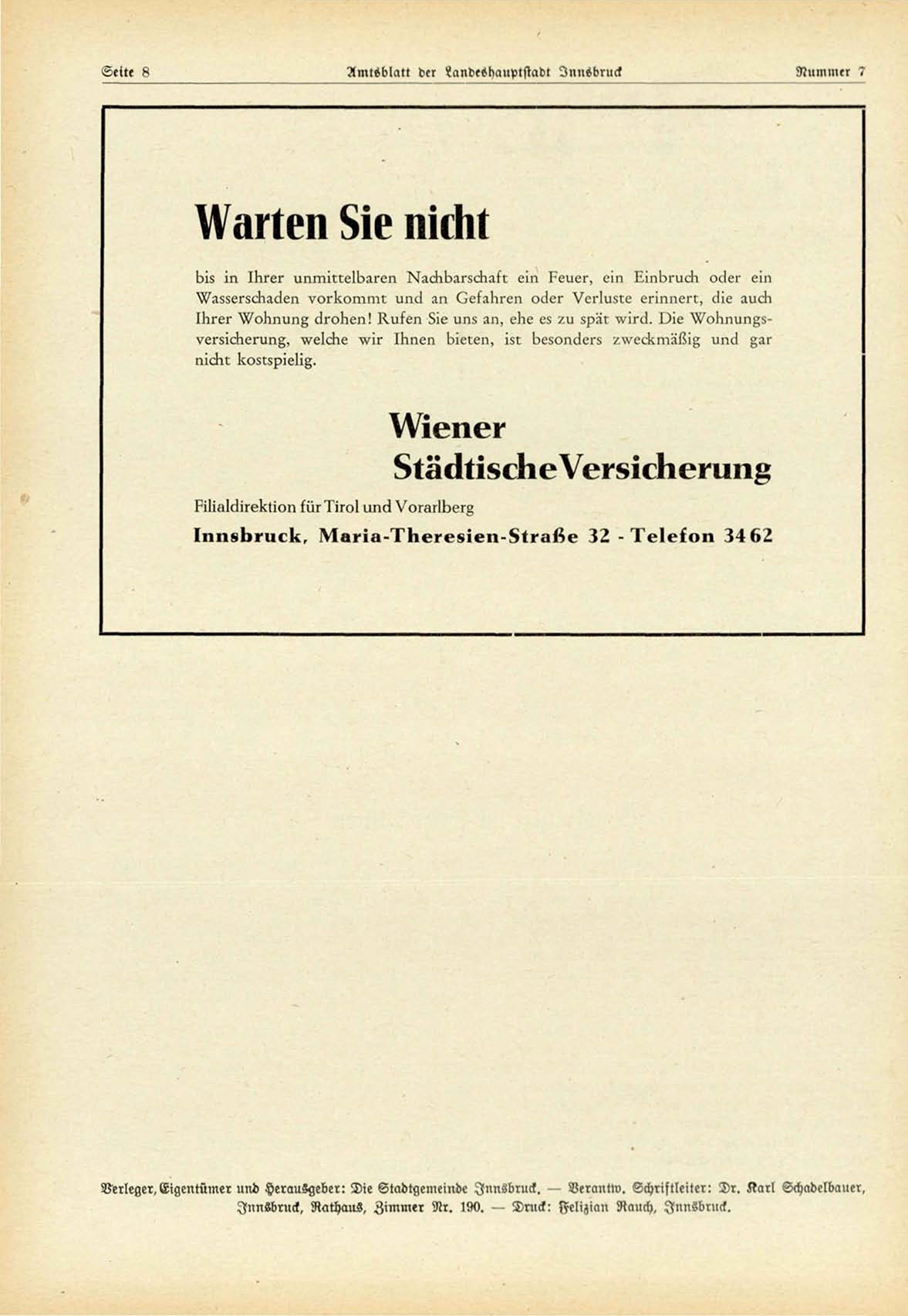 Verleger, Eigentümer und Herausgeber: Die Stadtgemeinde Innsbruck. — Verantw. Schriftleiter: Dr. Karl Schadelbauer,