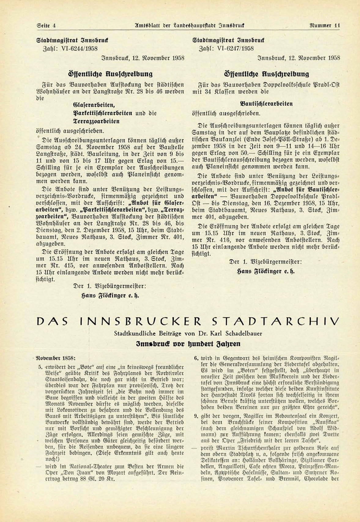 Samstag in der auf dem Bauplätze befindlichen städtischen Vaukanzlei (Ende Iosef-Pö"ll-Straße) ab I.Dezember 1958 in der Zeit von 9—11 und 14—16 Uhr