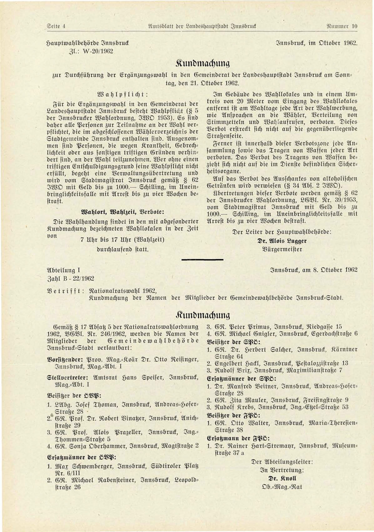 Kundmachung der Namen der Mitglieder der Gemeindewahlbehö"rde Innsbruck-Stadt.