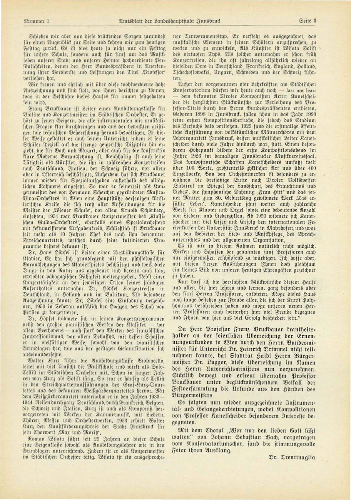 D a Herr Professor Franz Vruckbauer krankheitshalber an der feierlichen Überreichung der E r n e n nungsurkunden i n W i e n durch den H e r r n V u n d e s m i nister für Unterricht D r . Heinrich D r i m m e l nicht teilnehmen konnte, bat S t a d t r a t Haidl H e r r n B ü r g e r meister D r . l u g g e r , diese Überreichung im Namen