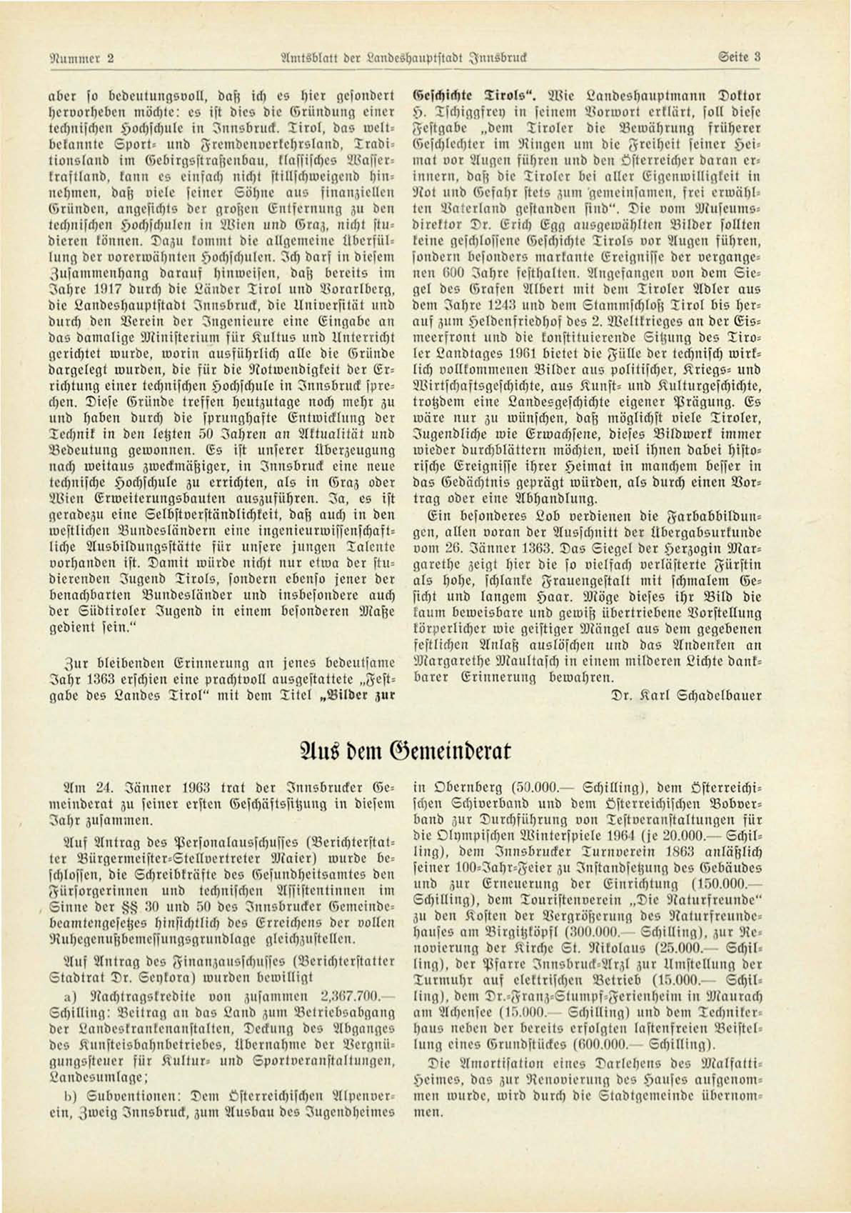 Am 24. Jänner 1963 trat der Innsbrucker Gemeiuderat zu seiner ersten Geschäftssitznng in diesem