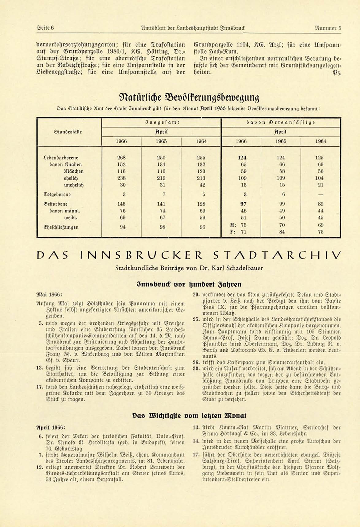 Oas Statistische Amt der Stadt Innsbruck gibt für den Monat /ìpril 1966 folgende Levölkerungsbewegung bekannt!
