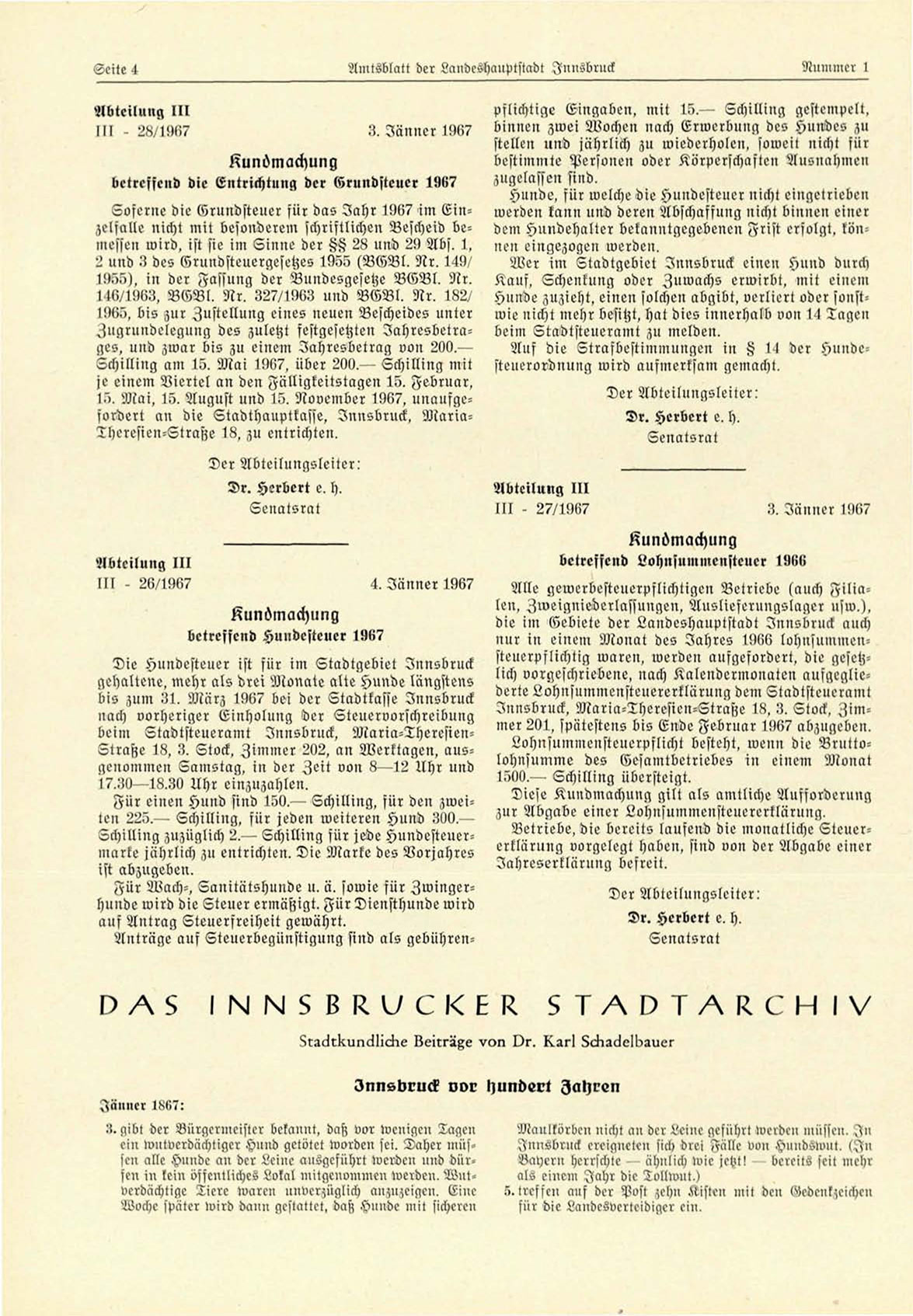 bis zum 31. März 1967 bei der Etadtkasse Innsbruck