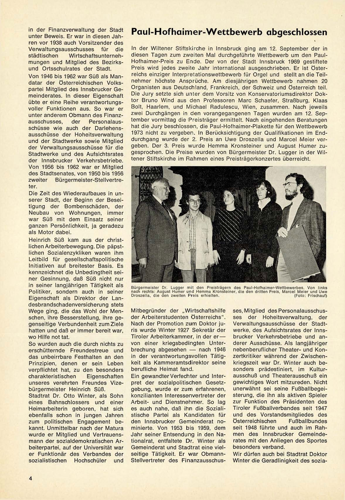 diesen T a g e n z u m z w e i t e n Mal durchgeführte Wettbewerb um den P a u l H o f h a i m e r - P r e i s zu E n d e . Der von der Stadt Innsbruck 1969 gestiftete