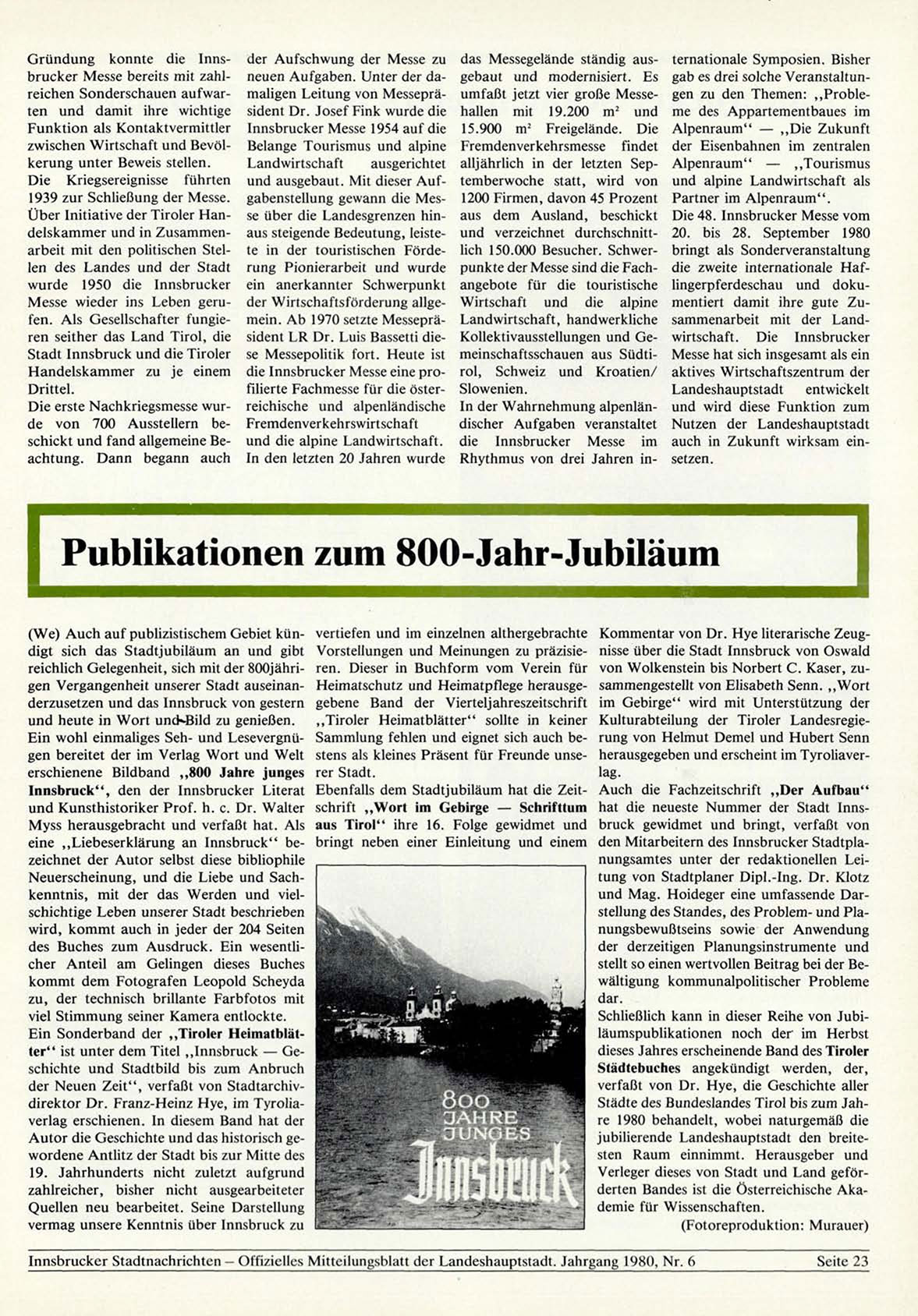 Innsbrucker Stadtnachrichten — Offizielles Mitteilungsblatt der Landeshauptstadt. Jahrgang 1980, N r . 6