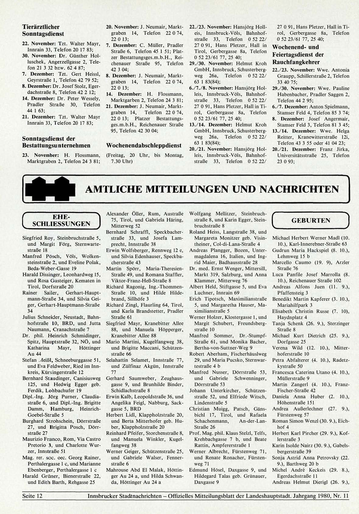 Innsbrucker Stadtnachrichten - Offizielles Mitteilungsblatt der Landeshauptstadt. Jahrgang 1980, Nr. 11