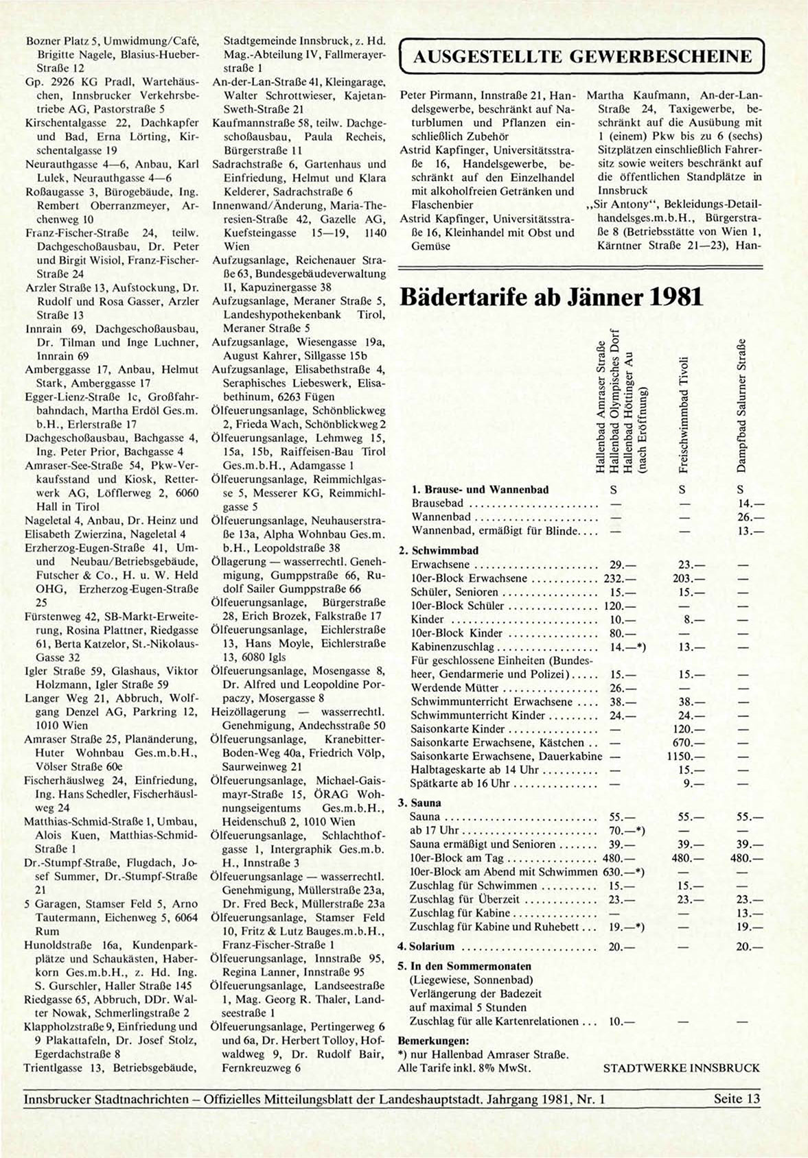 Innsbrucker Stadtnachrichten - Offizielles Mitteilungsblatt der Landeshauptstadt. Jahrgang 1981, Nr. 1