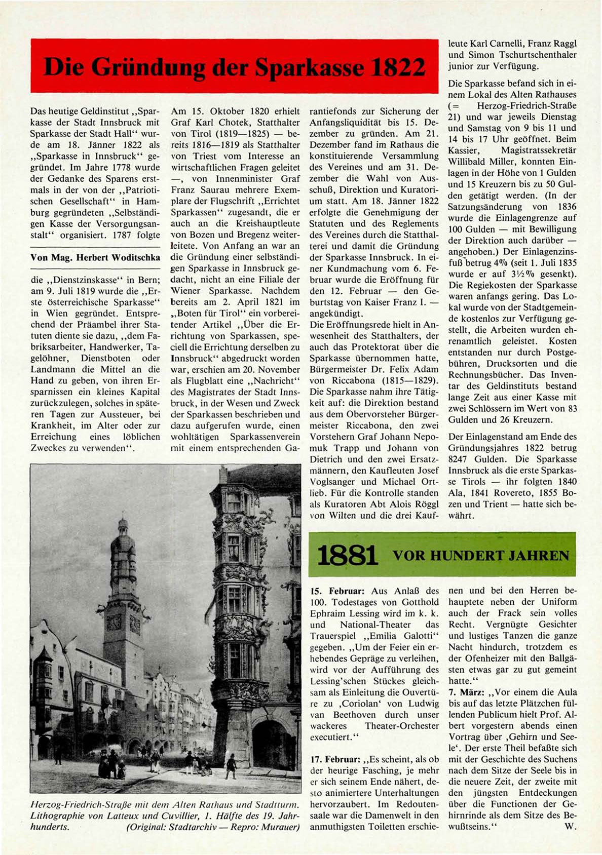 Von Mag. Herbert Woditschka die Gründung einer selbständigen Sparkasse in Innsbruck gedie „Dienstzinskasse" in Bern; dacht, nicht an eine Filiale der