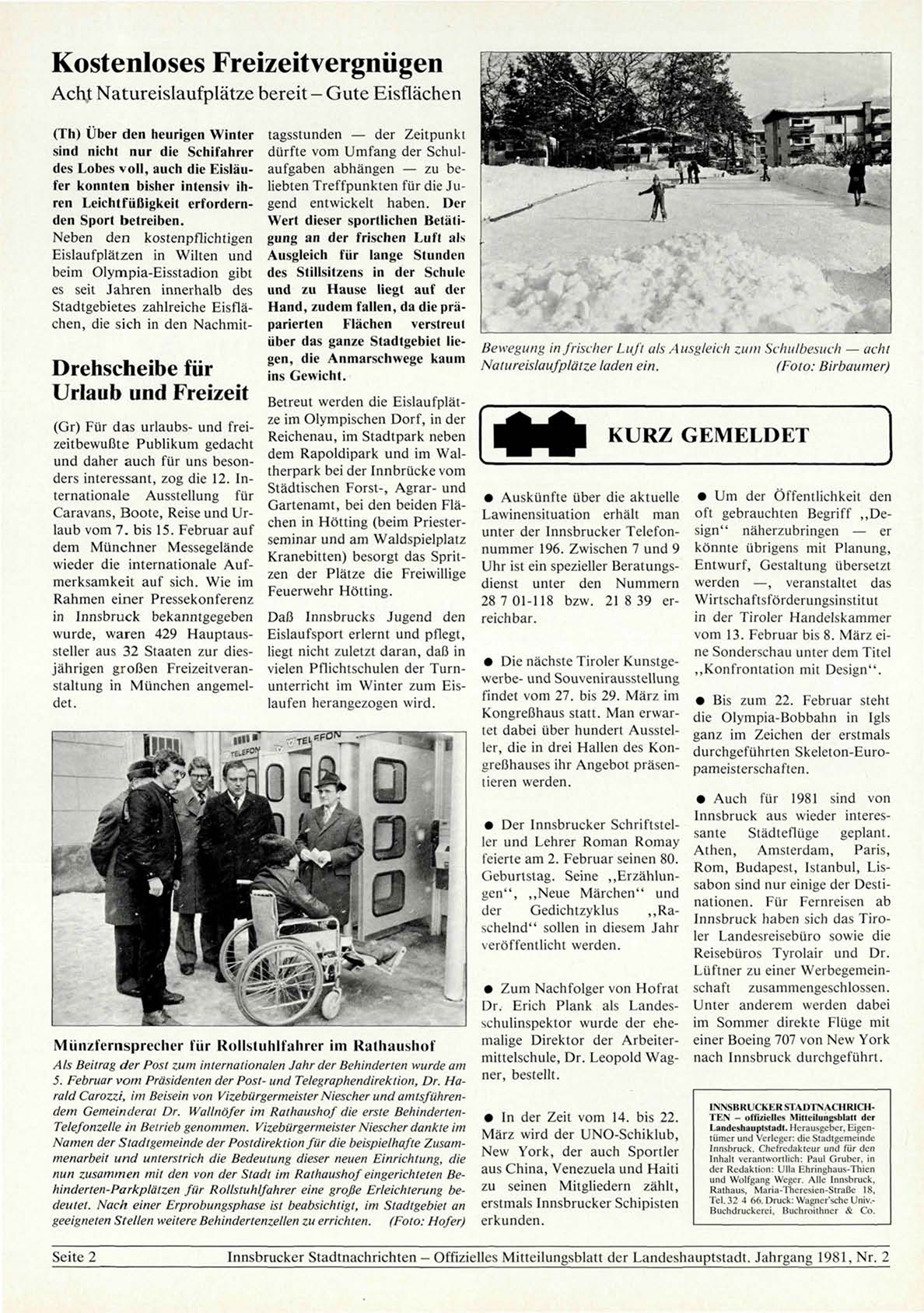 Innsbrucker Stadtnachrichten — Offizielles Mitteilungsblatt der Landeshauptstadt. Jahrgang 1981, Nr. 2