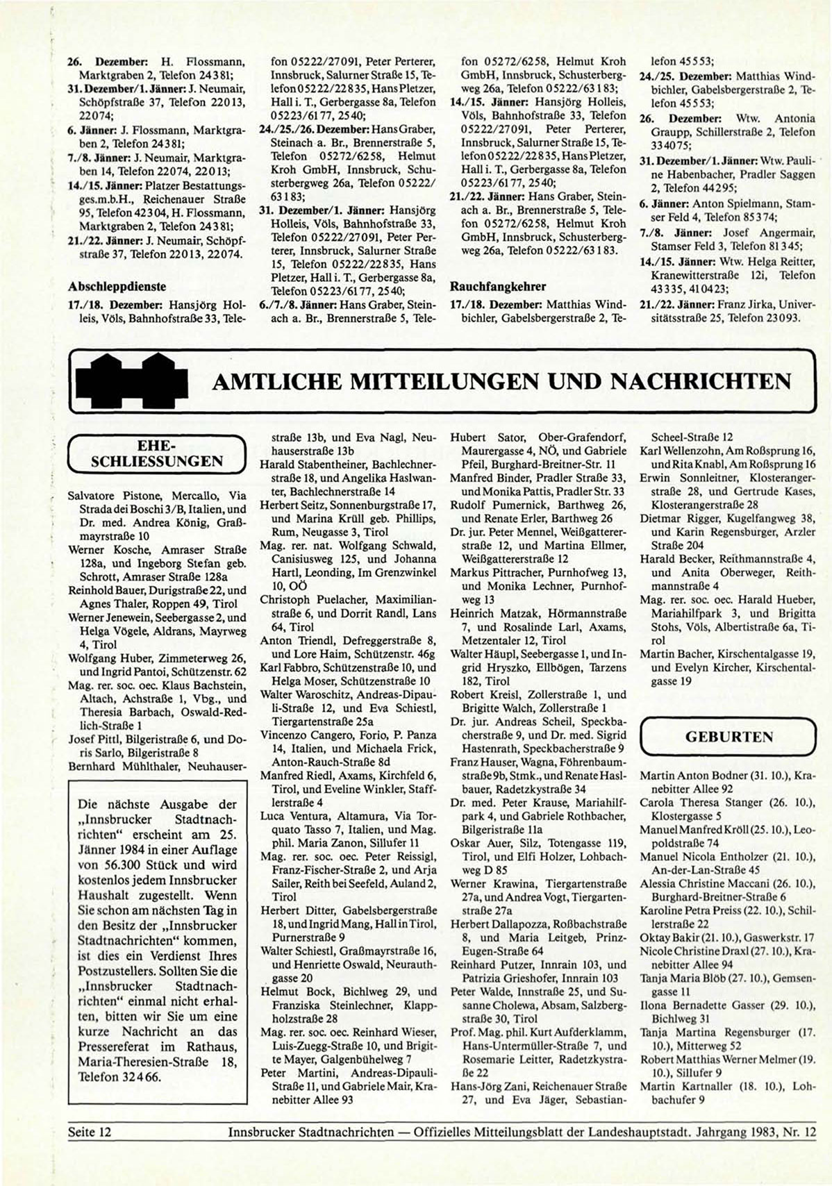 Innsbrucker Stadtnachrichten — Offizielles Mitteilungsblatt der Landeshauptstadt. Jahrgang 1983, Nr. 12