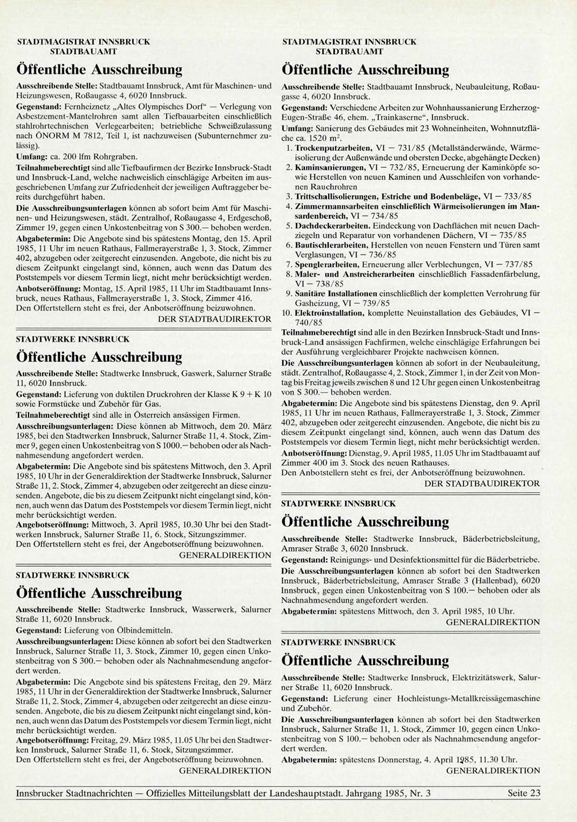 Anbotseröifnung: Montag, 15. April 1985, 11 Uhr im Stadtbauamt Innsbruck, neues Rathaus, Fallmerayerstraße 1, 3. Stock, Zimmer 416.
