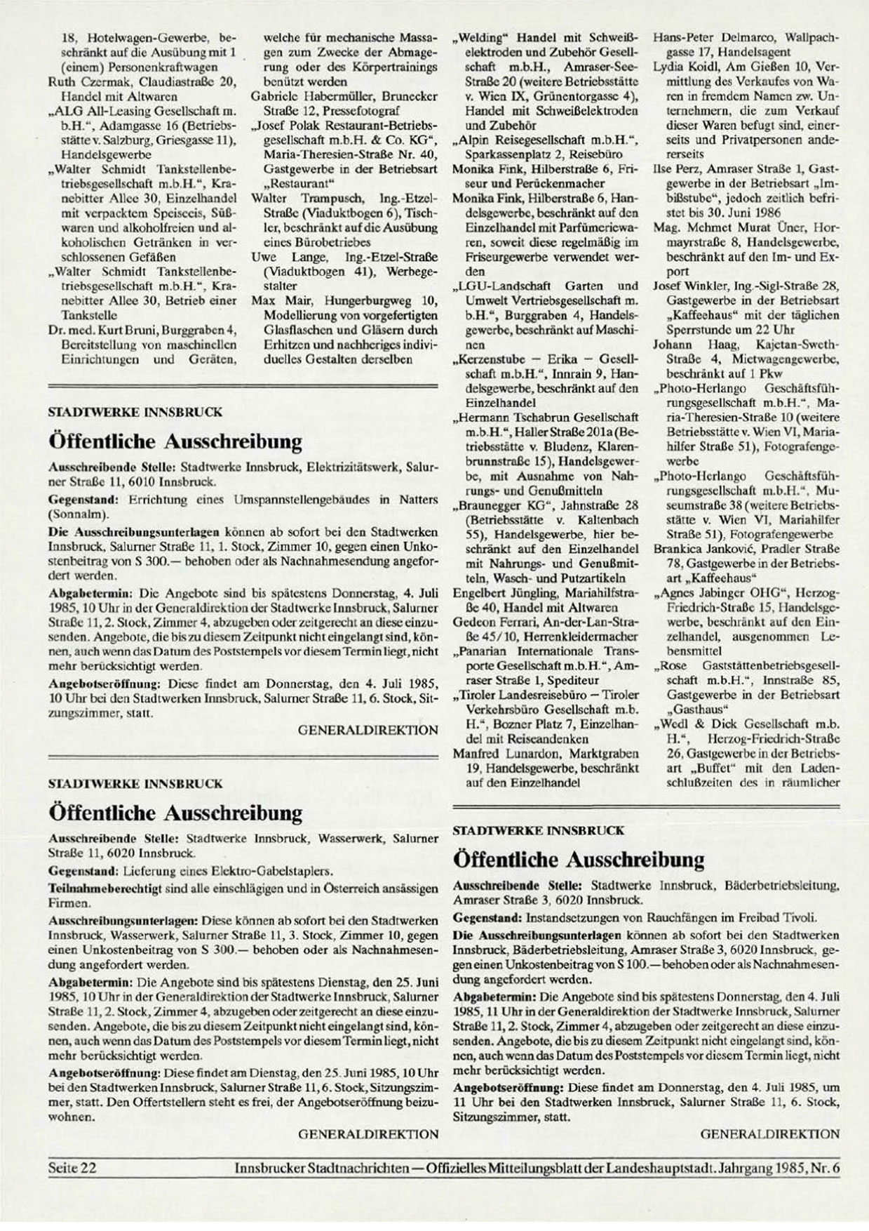 Angebotseröffnung: Diese findet am Dienstag, den 25. Juni 1985, 10 Uhr bei den Stadtwerken Innsbruck, Salurner Straße 11, 6. Stock, Sitzungszimmer, statt. Den Offertstellern steht es frei, der Angebotseröffnung beizuwohnen.