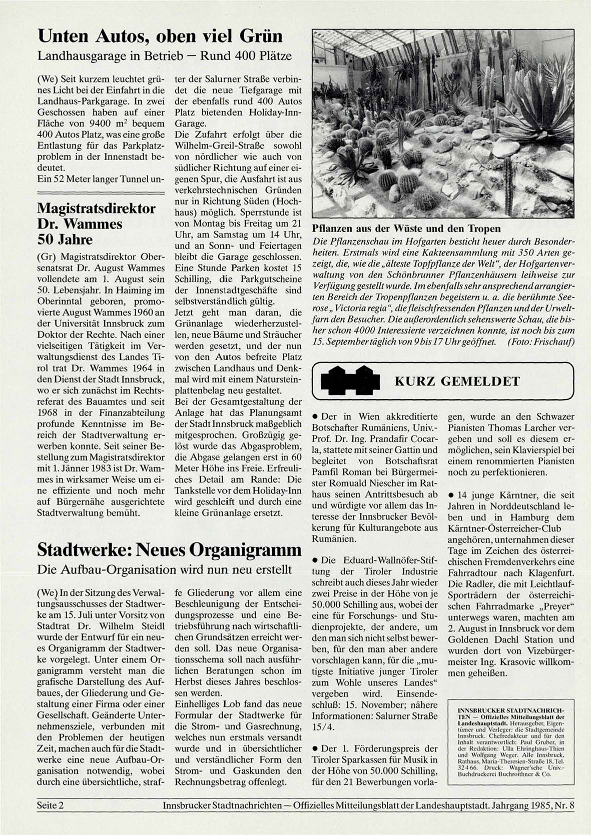 Innsbrucker Stadtnachrichten — Offizielles Mitteilungsblatt der Landeshauptstadt. Jahrgang 1985, Nr. 8