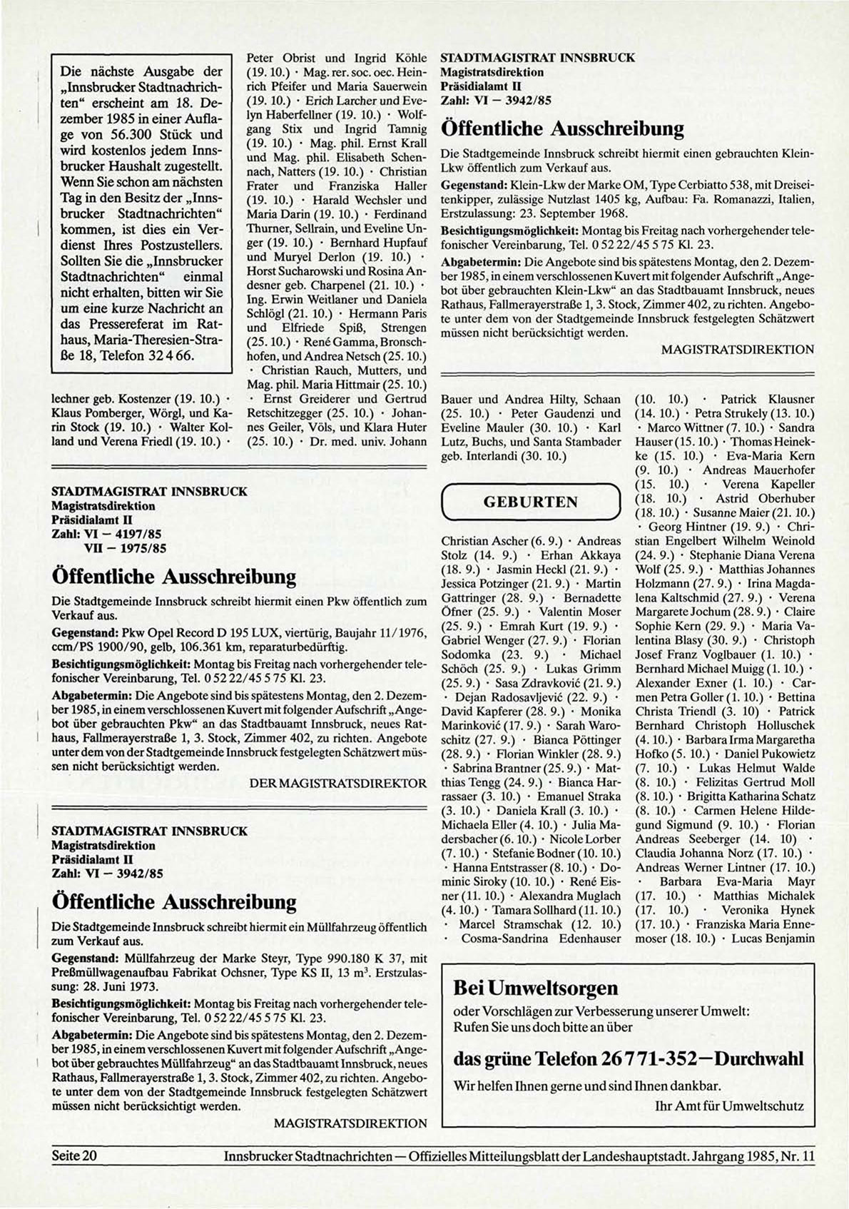 Innsbrucker Stadtnachrichten — Offizielles Mitteilungsblatt der Landeshauptstadt. Jahrgang 1985, Nr. 11