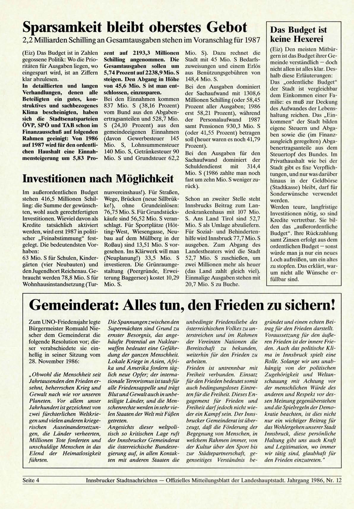 Innsbrucker Stadtnachrichten — Offizielles Mitteilungsblatt der Landeshauptstadt. Jahrgang 1986, Nr. 12