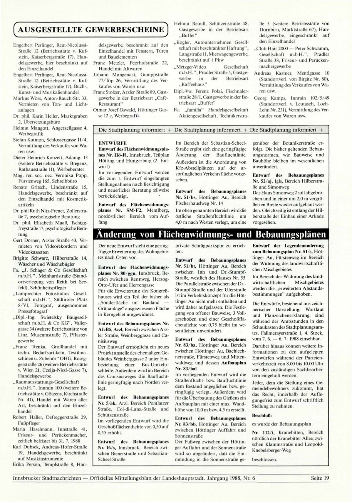 Innsbrucker Stadtnachrichten — Offizielles Mitteilungsblatt der Landeshauptstadt. Jahrgang 1988, Nr. 6