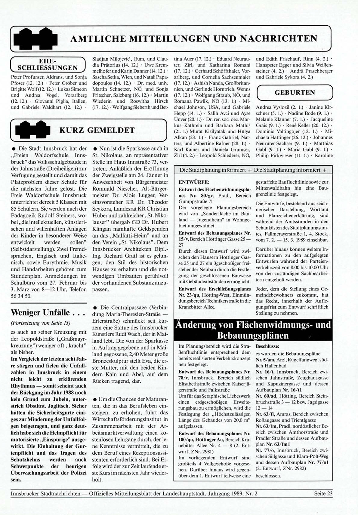 Innsbrucker Stadtnachrichten — Offizielles Mitteilungsblatt der Landeshauptstadt. Jahrgang 1989, Nr. 2