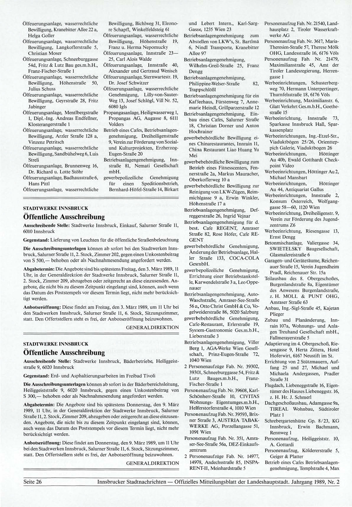 Innsbrucker Stadtnachrichten — Offizielles Mitteilungsblatt der Landeshauptstadt. Jahrgang 1989, Nr. 2