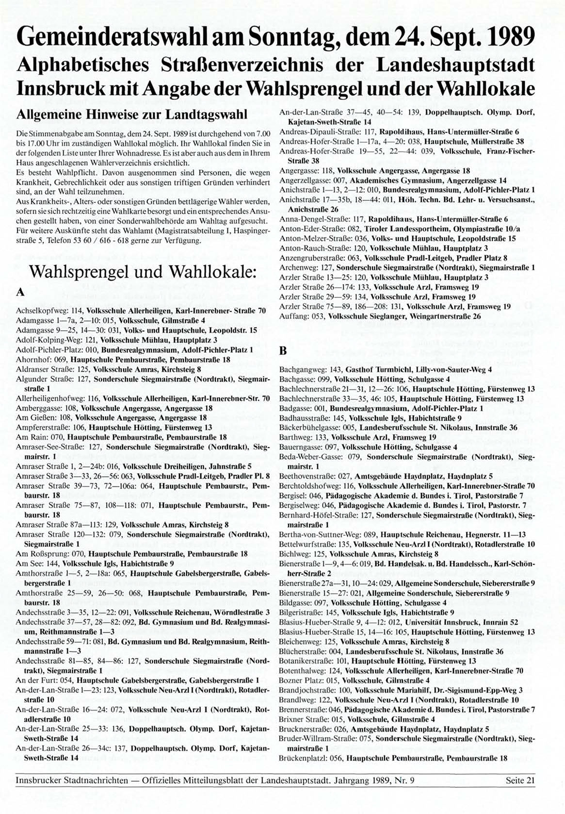 Innsbrucker Stadtnachrichten — Offizielles Mitteilungsblatt der Landeshauptstadt. Jahrgang 1989, Nr. 9