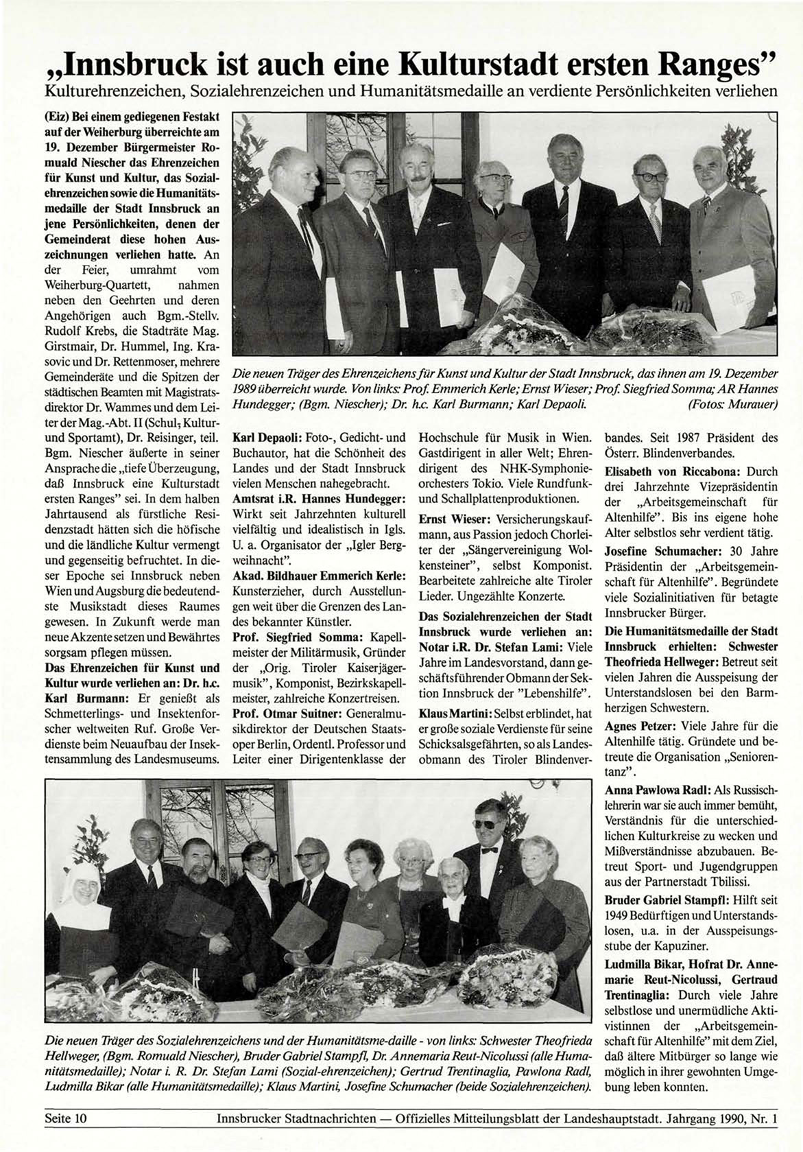 Hellweger, (Bgm. Romuald Niescher), Bruder Gabriel Stampfl, Dr. Annemaria Reut-Nicolussi (alle Humanitätsmedaille); Notar i. R. Dr. Stefan Lami (Sozial-ehrenzeichen); Gertrud Trentinaglia, Pawlona Radi,