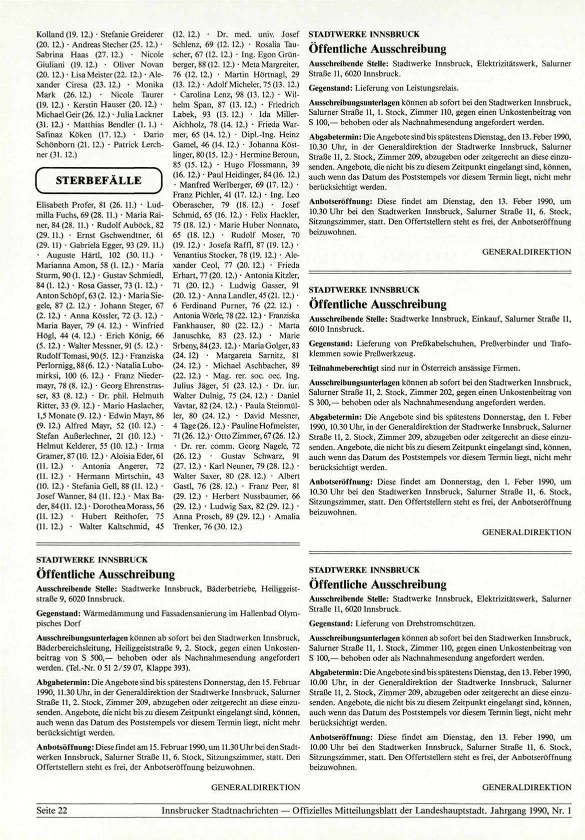 Anbotsöffnung: Diese findet am 15. Februar 1990, um 11.30Uhrbei den Stadtwerken Innsbruck, Salurner Straße 11, 6. Stock, Sitzungszimmer, statt. Den