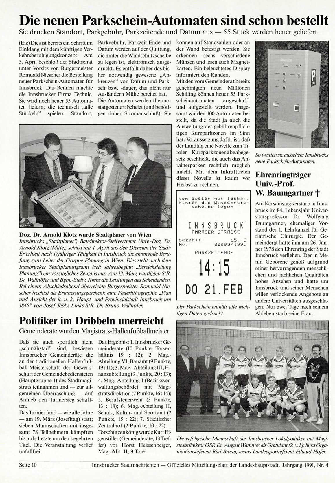 Innsbrucker Stadtnachrichten — Offizielles Mitteilungsblatt der Landeshauptstadt. Jahrgang 1991, Nr. 4