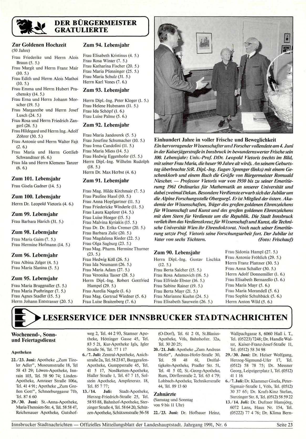 verlieh ihm das Verdienstkreuz für Wissenschaft und Kunst, die Technische Universität Wien ihr Ehrendoktorat. Noch nach seiner Emeritierung setzte Prof. Vietoris seine Forschungsarbeit fort. Der Jubilar ist