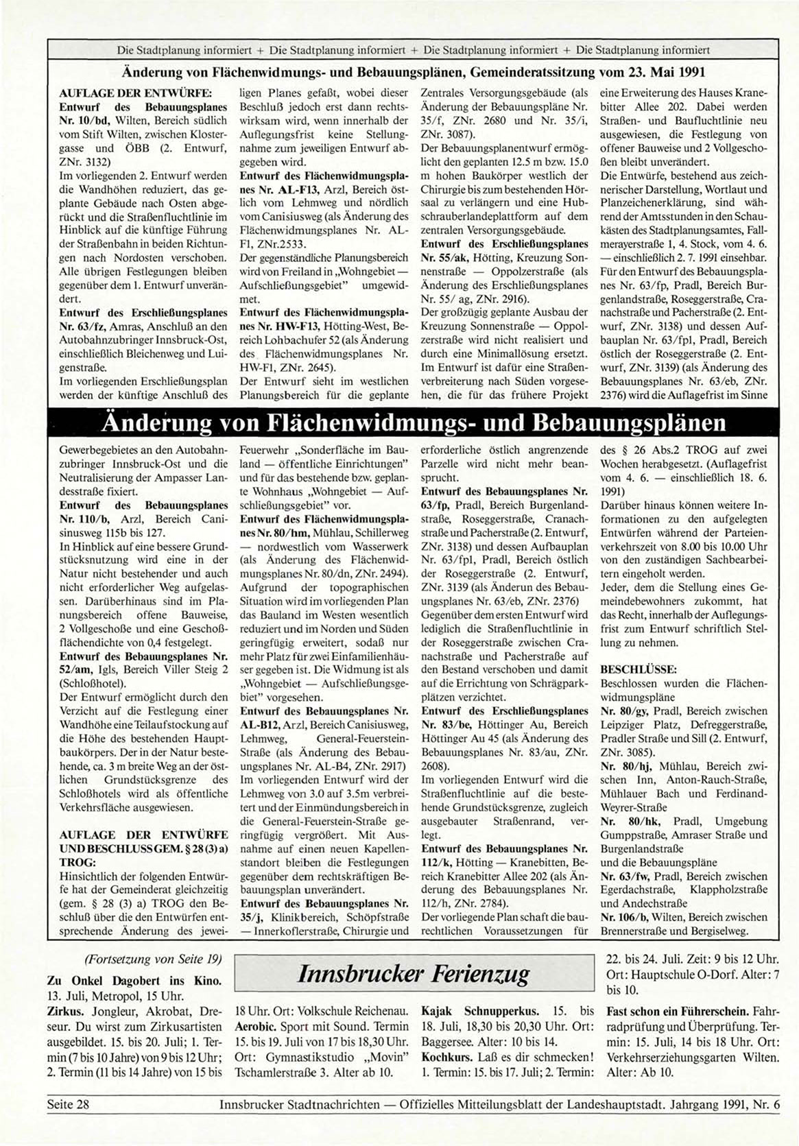 Innsbrucker Stadtnachrichten — Offizielles Mitteilungsblatt der Landeshauptstadt. Jahrgang 1991, Nr. 6
