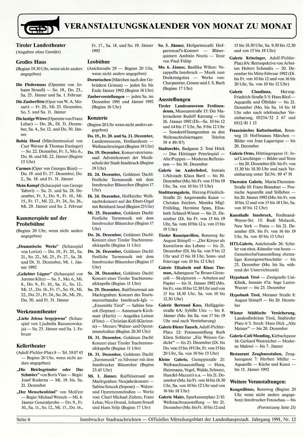 Innsbrucker Stadtnachrichten — Offizielles Mitteilungsblatt der Landeshauptstadt. Jahrgang 1991, Nr. 12
