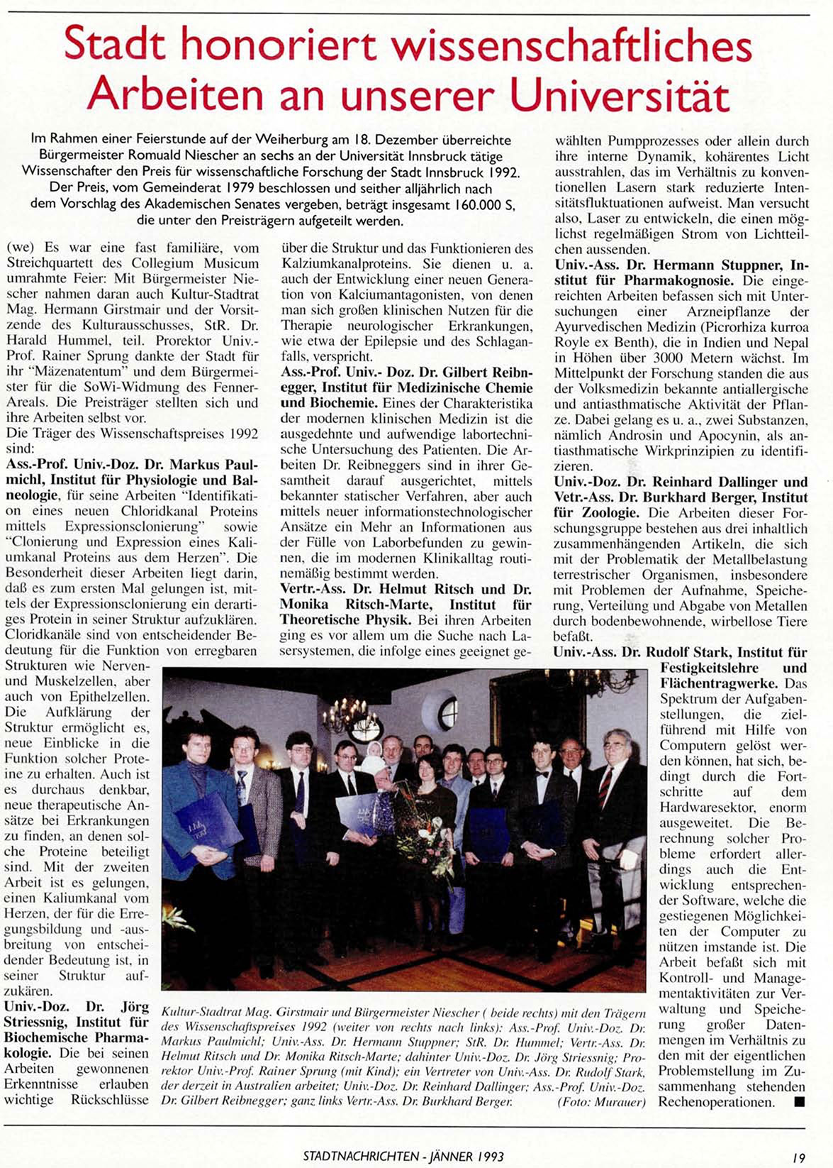 Wissenschafter den Preis für wissenschaftliche Forschung der Stadt Innsbruck 1992.
