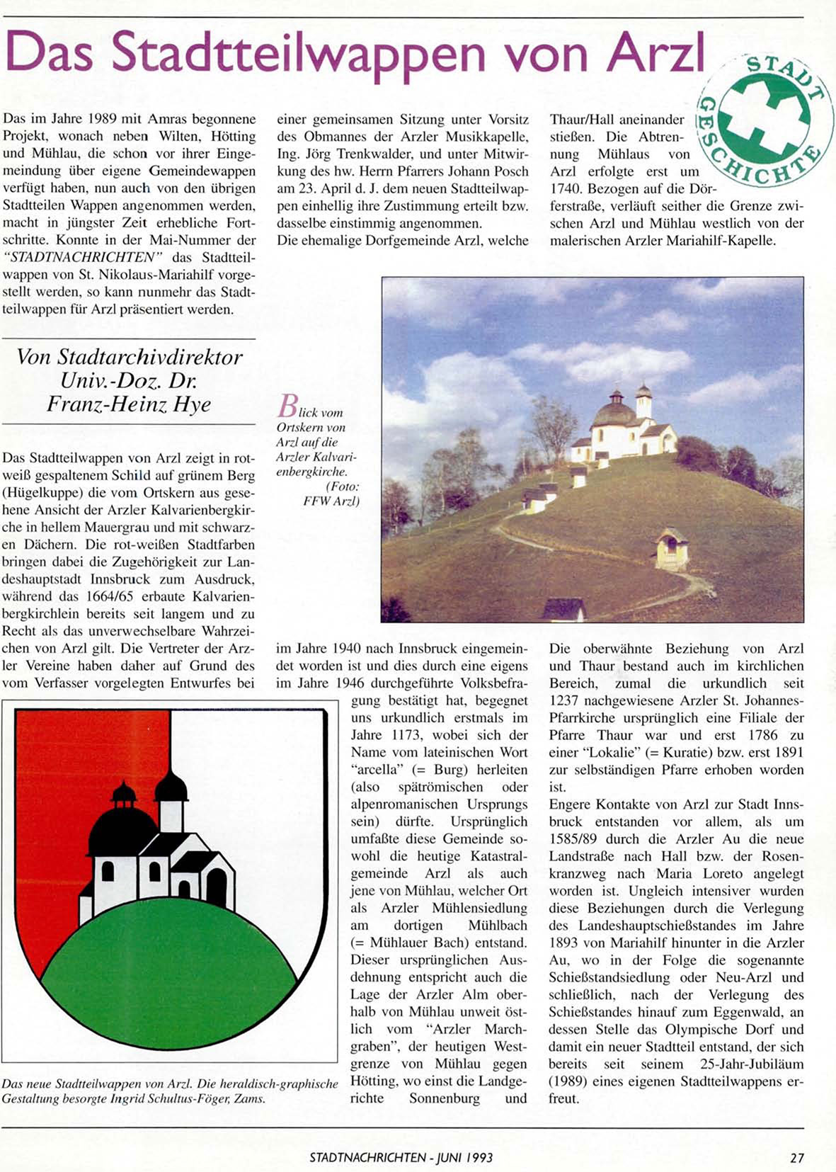 ""STADTNACHRICHTEN" das Stadtteilwappen von St. Nikolaus-Mariahilf vorgestellt werden, so kann nunmehr das Stadtteil wappen für Arzl präsentiert werden.