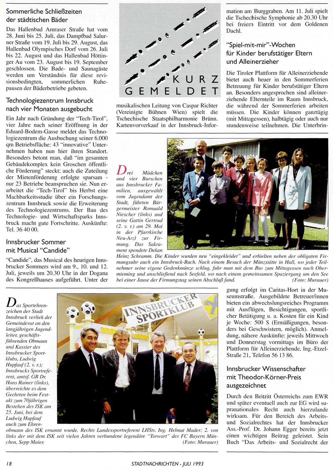Heinz Schramm. Die Kinder wurden neu "eingekleidet" und erhielten neben der obligaten Firmungsuhr auch ein Innsbruck-Buch. Nach einem Besuch der Münzstätte in Hall, wo jeder Teilnehmer seine eigene Gedenkmünze schlug, fuhr man mit dem Bus zum Mittagessen nach Obermieming und anschließend nach Seefeld, wo nach einem gemeinsamen Spaziergang um den See