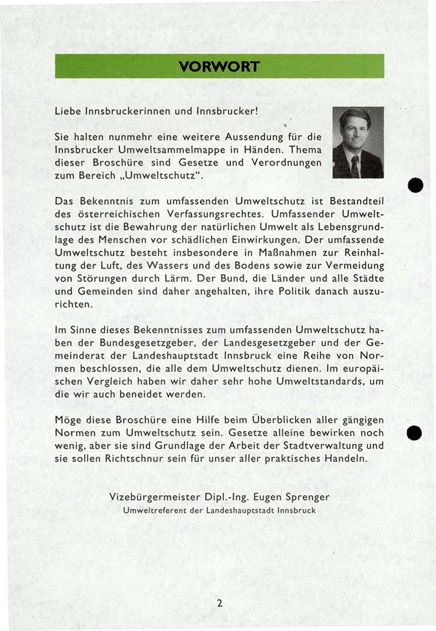 Im Sinne dieses Bekenntnisses zum umfassenden Umweltschutz haben der Bundesgesetzgeber, der Landesgesetzgeber und der Gemeinderat der Landeshauptstadt Innsbruck eine Reihe von Normen beschlossen, die alle dem Umweltschutz dienen. Im europäischen Vergleich haben wir daher sehr hohe Umweltstandards, um