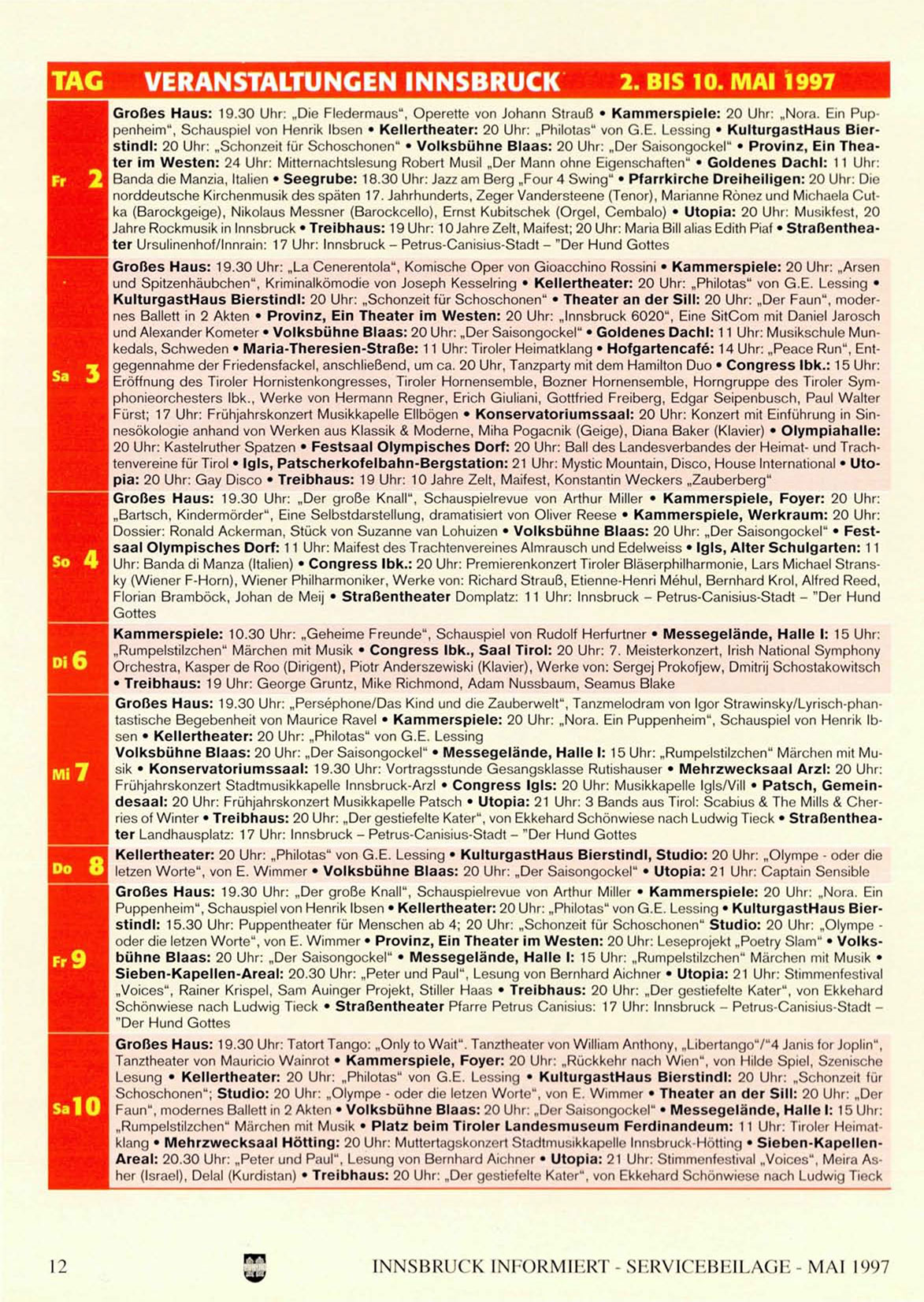 Jahre Rockmusik in Innsbruck • Treibhaus: 19 Uhr: 10 Jahre Zelt, Maitest; 20 Uhr: Maria Bill alias Edith Piaf • Straßentheater Ursulinenhof/Innrain: 1 7 Uhr: Innsbruck - Petrus-Canisius-Stadt - "Der Hund Gottes