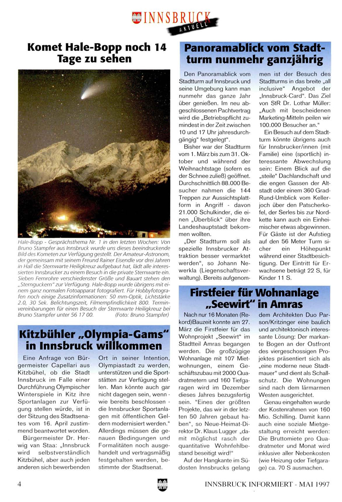 werden", so Johann Nein Hall die Sternwarte Heiligkreuz aufgebaut hat, lädt alle interessierten Innsbrucker zu einem Besuch in die private Sternwarte ein. werkla (LiegenschaftsverSieben Fernrohre verschiedenster Größe und Bauart stehen den waltung). Bereits aufgenom„Sternguckern"zur Verfügung. Hale-Bopp wurde übrigens mit einem ganz normalen Fotoapparat fotografiert. Für Hobbyfotografen noch einige Zusatzinformationen: 50 mm-Optik, Lichtstärke