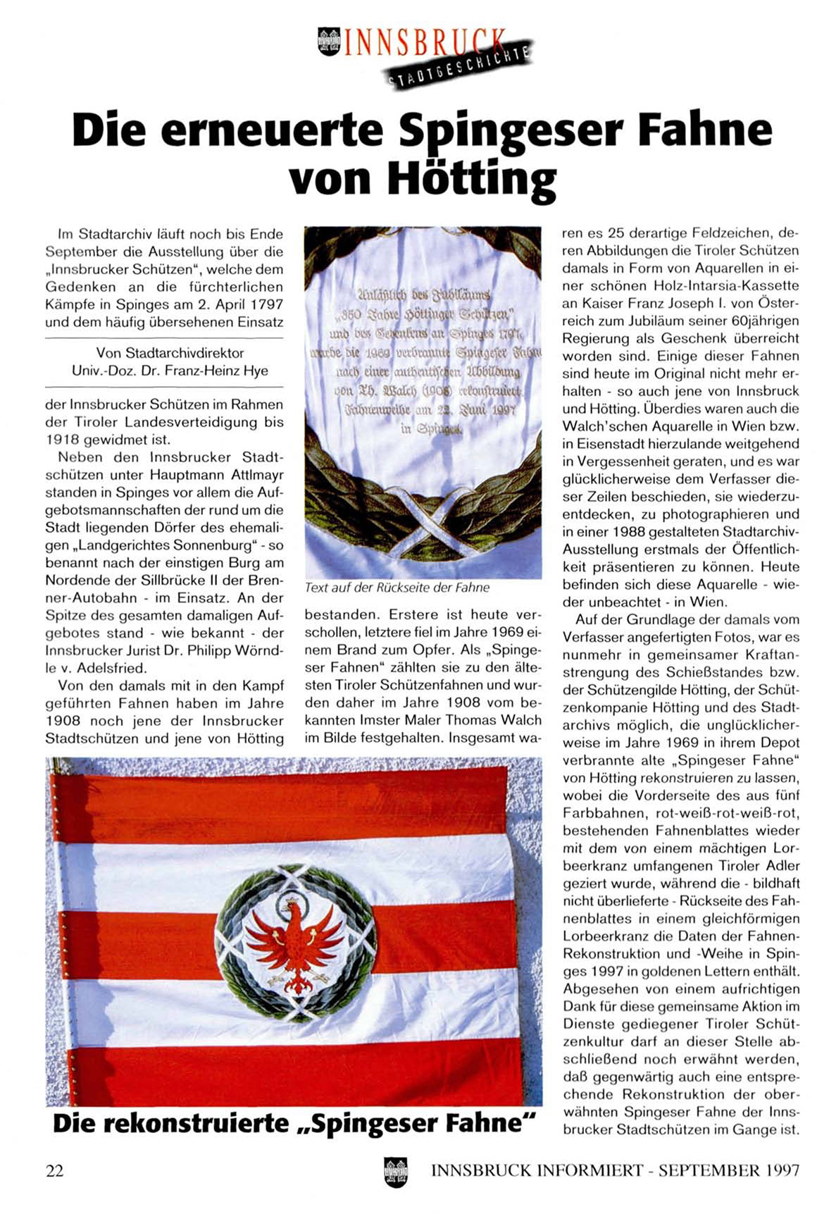 daß gegenwärtig auch eine entsprechende Rekonstruktion der oberwähnten Spingeser Fahne der Innsbrucker Stadtschützen im Gange ist.