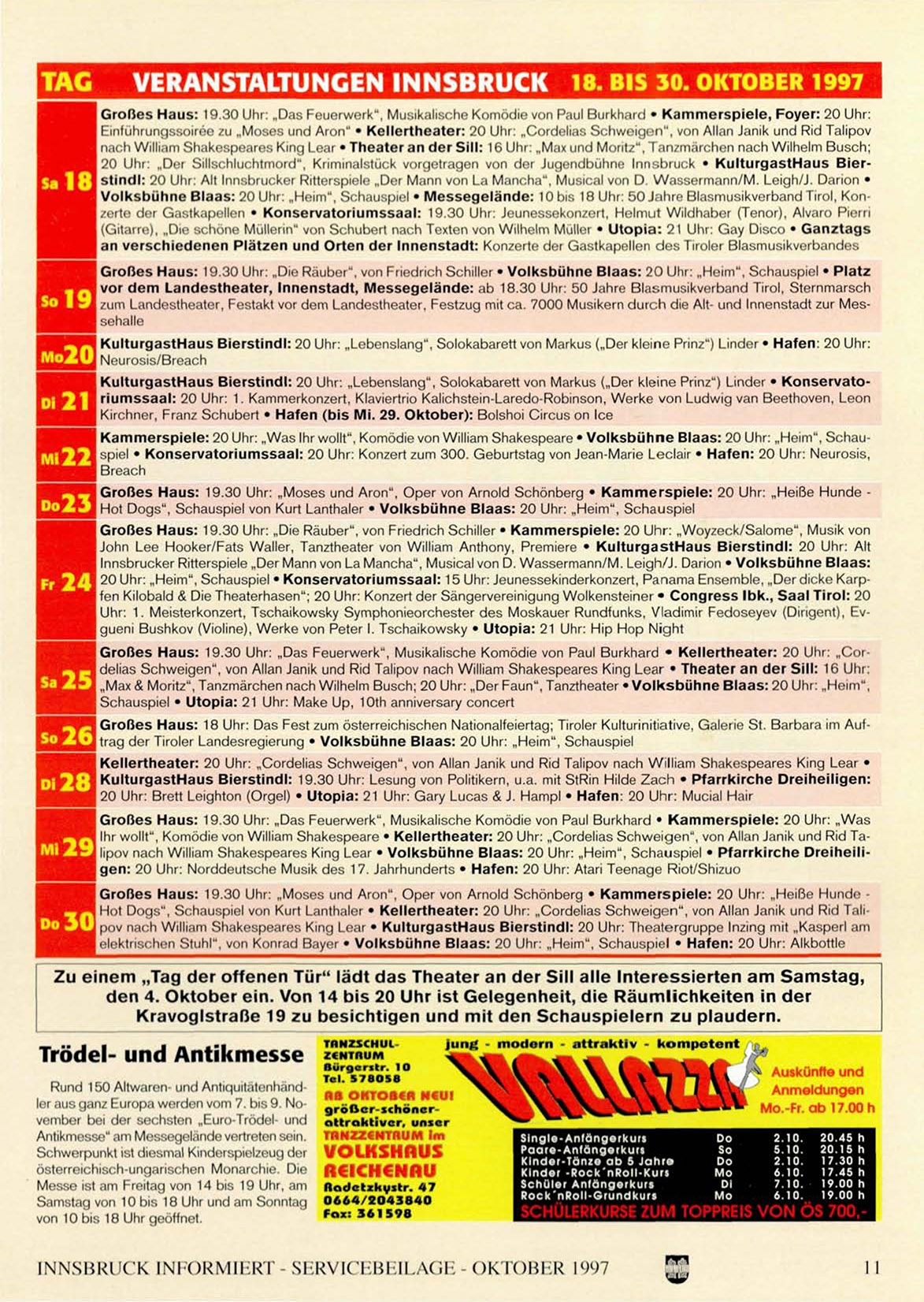 Großes Haus: 19.30 Uhr: „Moses und Aron", Oper von Arnold Schönberg • Kammerspiele: 20 Uhr: „Heiße Hunde Hot Dogs", Schauspiel von Kurt Lanthaler • Kellertheater: 20 Uhr: „Cordelias Schweigen", von Allan Janik und Rid Tali3 0pov nach William Shakespeares King Lear • KulturgastHaus Bierstindl: 20 Uhr: Theatergruppe Inzing mit „Kasperl am