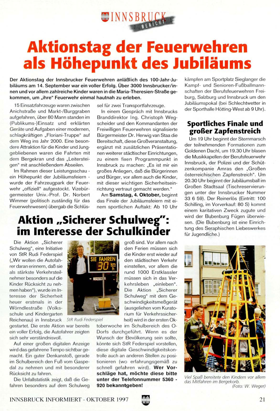 Der Aktionstag der Innsbrucker Feuerwehren anläßlich des 100-Jahr-Jubiläums am 14. September war ein voller Erfolg. Über 3000 Innsbrucker/innen und vor allem zahlreiche Kinder waren in die Maria-Theresien-Straße gekommen, um „ihre" Feuerwehr einmal hautnah zu erleben.