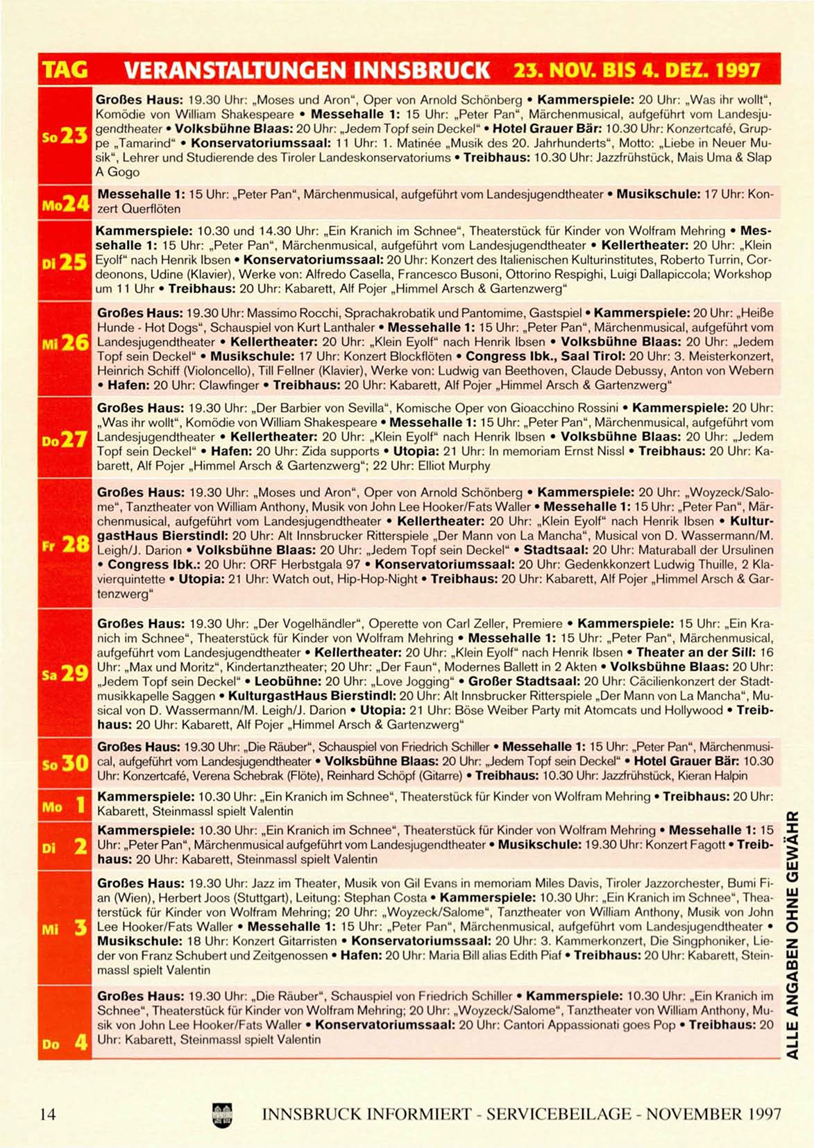 • Congress Ibk.: 20 Uhr: ORF Herbstgala 97 • Konservatoriumssaal: 20 Uhr: Gedenkkonzert Ludwig Thuille, 2 Klavierquintette • Utopia: 21 Uhr: Watch out, Hip-Hop-Night • Treibhaus: 20 Uhr: Kabarett, Alf Pojer „Himmel Arsch & Gartenzwerg"