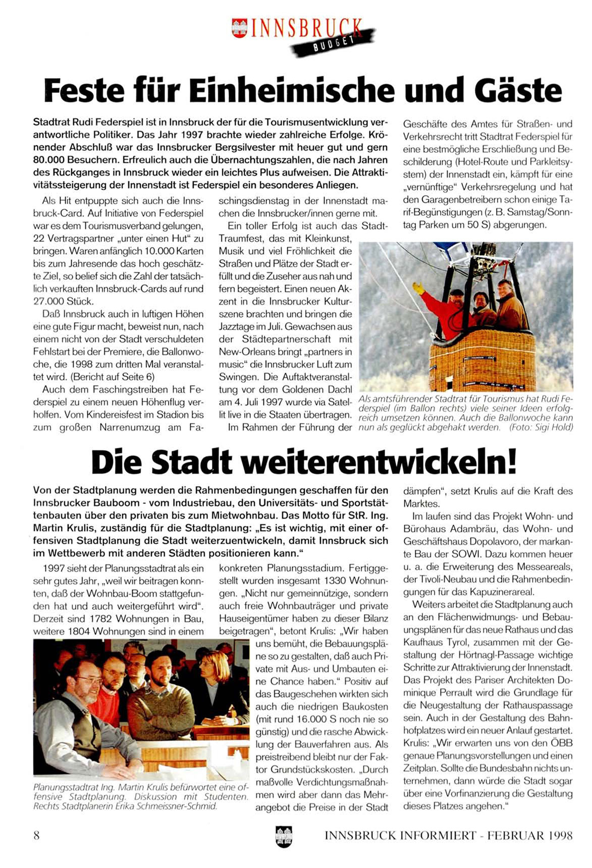 Stadtrat Rudi Federspiel ist in Innsbruck der für die Tourismusentwicklung verantwortliche Politiker. Das Jahr 1997 brachte wieder zahlreiche Erfolge. Krönender Abschluß war das Innsbrucker Bergsilvester mit heuer gut und gern